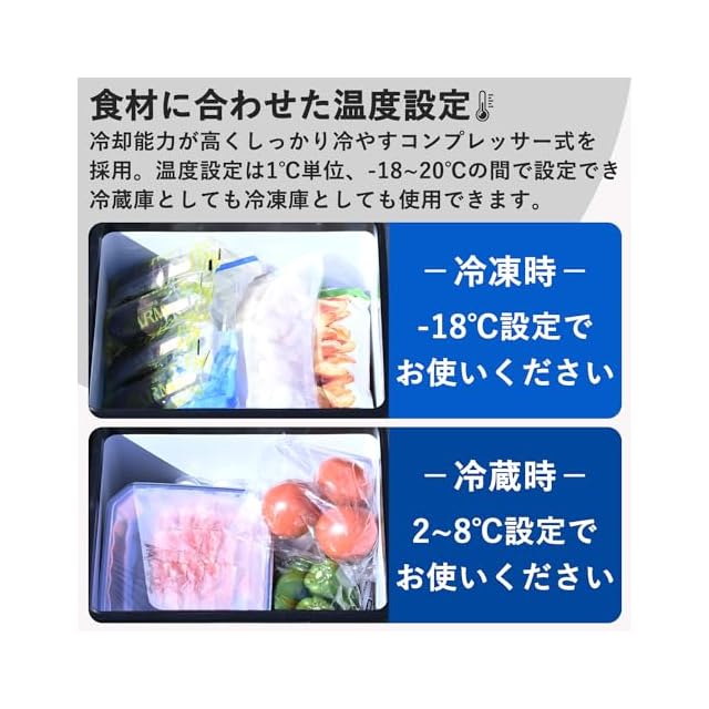【コンプレッサー式】ペルチェ式と比較しコンプレッサー式は冷却能力が高く、食材に合わせて-18~20度で温度を設定できるので、冷蔵庫としても冷凍庫としても使用でき、夏場など暑さによる食材の傷みも心配いりません。