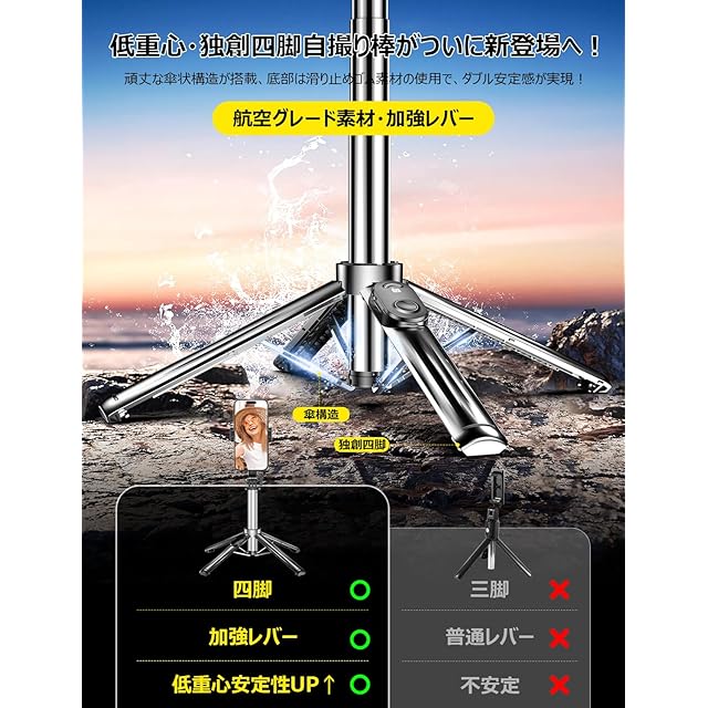 【独創四脚デザイン・安定性業界Top!】新傑作❣究極安定性な四脚式自撮り棒がついに新登場へ!!弊社が従来の三脚式自撮り棒を向上して、安定性とデザインを中心に安定性究極な四脚式自撮り棒を開発された。従来の三脚じどり棒 により、四脚を支える加強レバーが採用されていることで約20kgの重さにも耐えられるため、カメラなどスマートフォンより重いモノも使うことができます。更に底部は滑り止めゴム素材を使用しており、風が吹いていても、不安定な岩場や不整地でも、しっかりと立てられ、安定して撮影ができます!また、クランプ部の両側にゴムが付いているので、スマホを傷や滑りの心配がありません。