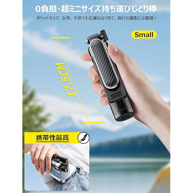 【0負担・超ミニサイズ・持ち運べ便利】様々なシーンで自撮り棒を活用できるようにするため、安定性を維持すると同時に、可能な限りサイズを小さくしました。折り畳んだ状態で17.5㎝、500mlのペットボトルよりも小さい、気軽に持ち運べます。旅行でもピクニックでも小さなトートバッグやポケットに入れて、いつでもどこでも美しい瞬間を記録できます。また、コンパクトのデザインでじどり棒わずか206gほど、スマホよりも軽く、女性や子供も疲れることが無く安心して撮影に臨めます。この軽量のセルカ棒で素晴らしい瞬間をキャッチしよう!