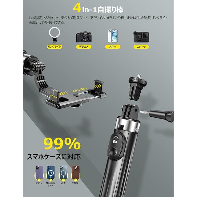 「一台多役・幅広い用途」セルカ棒とスマホ三脚を一体化された自撮り棒が遂に発売!四脚と一脚を自由変換、撮影、映画放送、TikTok、スマホスタンド、卓上スタンドとしてOKです。更に、取り替え式の1/4固定ネジをが付属しているため、カメラ、スマホ、美顔ライトが対応可能です。これ1台あれば、自撮りだけでなく、集合写真、動画鑑賞、ビデオ通話、生放送、Web会議などシーンでご利用頂けます。運動会、パレード、イベントなど人が集まる場所にも最適です。じどり棒&四脚で、思い出に残る特別な瞬間を切り取りましょう!