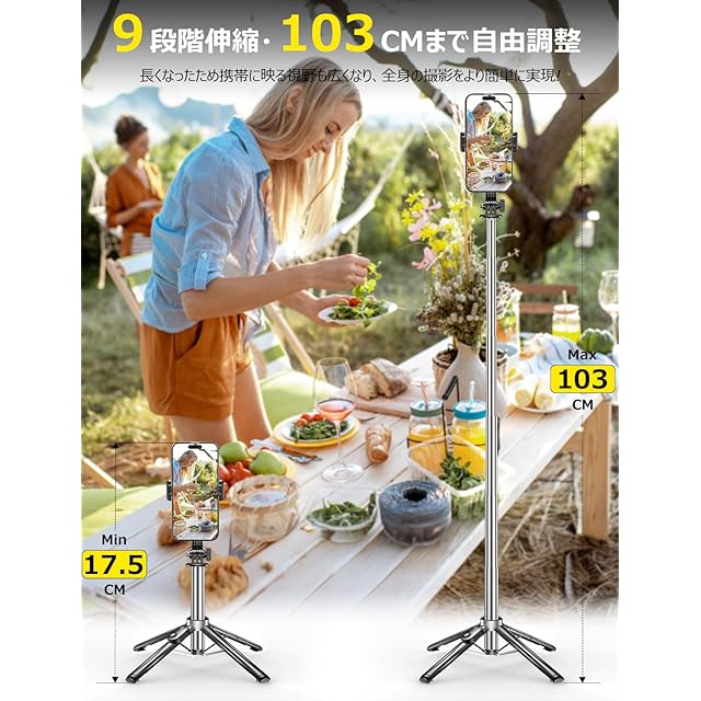 【9段階伸縮・360°+225°全方位調節】じどり棒のクランプは従来型にある水平360°回転を受け継いだ以外、より一層改良できたところはヘッド部分が225°まで折りたたむ形で角度の調整ができます。あらゆる角度の魅力を発揮できるので、写真を撮る角度を気にする必要はありません。自分自身や周辺環境のために高レベルの写真や動画をより簡単に撮ることができ、思い出を捉える機会を逃すことはありません。スマホスタンド部分は最大約103cmまで9段階伸縮可能なロングタイプで、1人での自撮りはもちろん、大人数での自撮り、視野の広い写真でも満足出来ます!