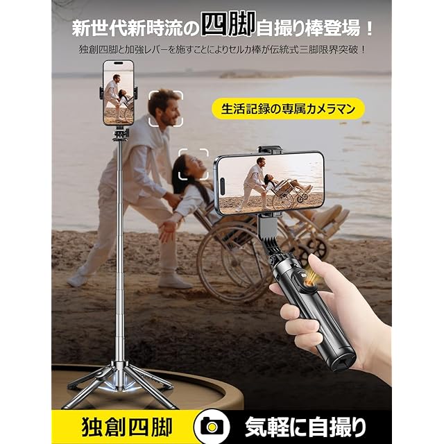 商品名:【独創四脚・0負担・超ミニサイズ】自撮り棒 じどり棒 スマホスタンド 安定性アップ スマホ 四脚 コンパクト 軽量 セルカ棒 折りたたみ式 最大103cmまで selfie stick 分離式リモコン 充電式 Bluetooth じどりぼう 9段階伸縮 携帯 スタンド 4-7インチ対応 自撮りだけでなく、集合写真、動画鑑賞、ビデオ通話、生放送、Web会議などに活用