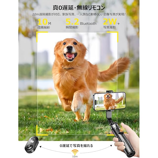 【分離式リモコン付き・真0遅延撮影】弊社のじどりぼうは業界最先進Bluetooth5.3チップを採用して、通信範囲や伝送速度が大幅にアップするため、境に左右されない優れた接続安定性を実現していて、ワンタップですぐに撮れる、遅延、途切れがありません。古いBluetooth4.2より、Bluetooth5.3は交換性も向上されまして、市販しているスマホを対応して、iOSとAndroidのどちらに対応していて、外出や旅行時、家族や友達同士で共用可能で、便利な自撮り棒です。また、通信距離を伸ばして、約10m離れた場所でも遠隔操作が可能で、手ブレを心配せずに集合写真や全身撮影が可能です。