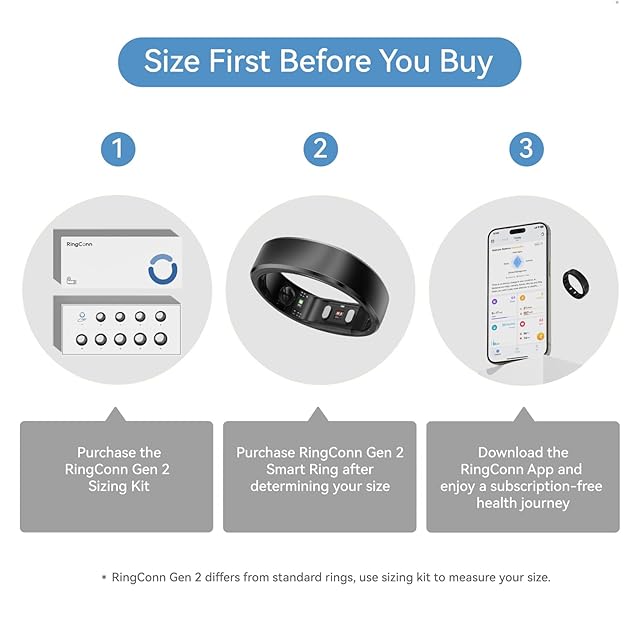 【購入前にサイズ確認】RingConn Gen 2スマートリングは他社の健康リングとは異なる独自のサイズ基準を採用しています。RingConn Gen 2サイズキットを使用することで、指に最も快適で正確なフィット感を見つけられ、購入前に正しいサイズを選択することで返品や交換の手間を防ぎます