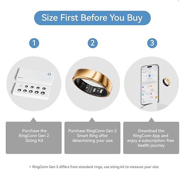 【購入前にサイズ確認】RingConn Gen 2スマートリングは他社の健康リングとは異なる独自のサイズ基準を採用しています。RingConn Gen 2サイズキットを使用することで、指に最も快適で正確なフィット感を見つけられ、購入前に正しいサイズを選択することで返品や交換の手間を防ぎます