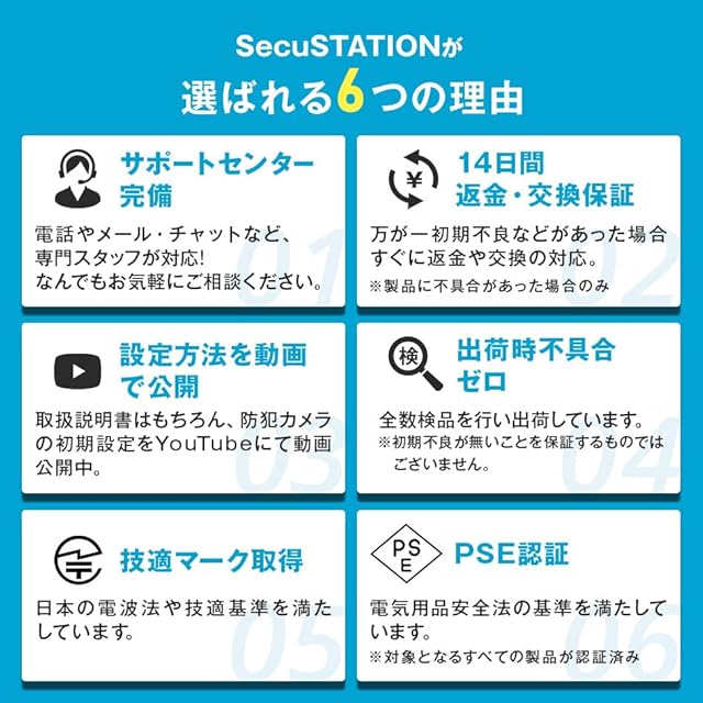 【あんしんの国内で充実のサポート体制】 防犯カメラで重要な事はアフターサポートです。 三重県に本社を置く防犯ステーションでは専属のサポートセンターを完備。ご購入後12ヶ月のメーカーで、万が一商品に不具合がある場合は、弊社までご連絡いただけましたら、専門のスタッフが対応させていただきます。ご購入前の不安な気持ち、ご購入後の疑問にも徹底サポートさせていただきます。
