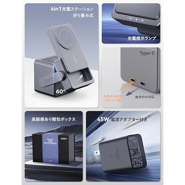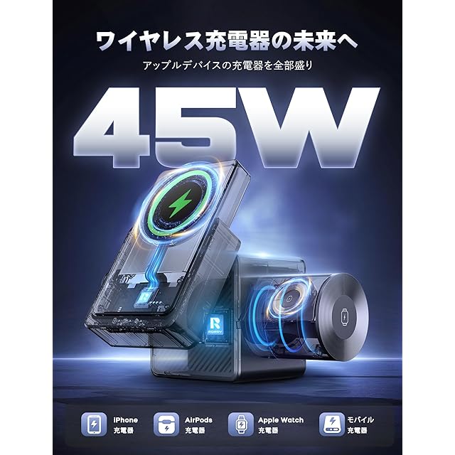 商品名:【自信作 究極の充電器 45W】RORRY ワイヤレス充電器 4in1 magsafe対応 モバイルバッテリー 10000mah 大容量 薄型 アップルウォッチ充電器 15W ワイヤレス充電 マグセーフ充電器 急速充電 45W USB-C電源アダプター付属 4台同時充電ステーション for iPhone/apple watch/airpods