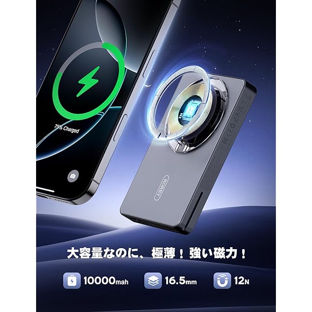 【10000mah大容量且つ薄い!】magsafe充電 器は超強力N54マグネットを採用し、、iPhoneを置くだけでピタッと安定して充電が開始されます。さらに10000mah大容量バッテリーと15W急速充電モードも搭載しながら、約16MMの超コンパクト設計を実現します。手のひらサイズなのでスマホにくっつけた状態で握ればそれほど負担に感じません。magsafe対応の薄型モバイルバッテリーはスリムで軽量、大容量でiPhone 16に約2回フル充電可能。1泊2日の旅行や出張や日帰りのアウトドアにも最適です。