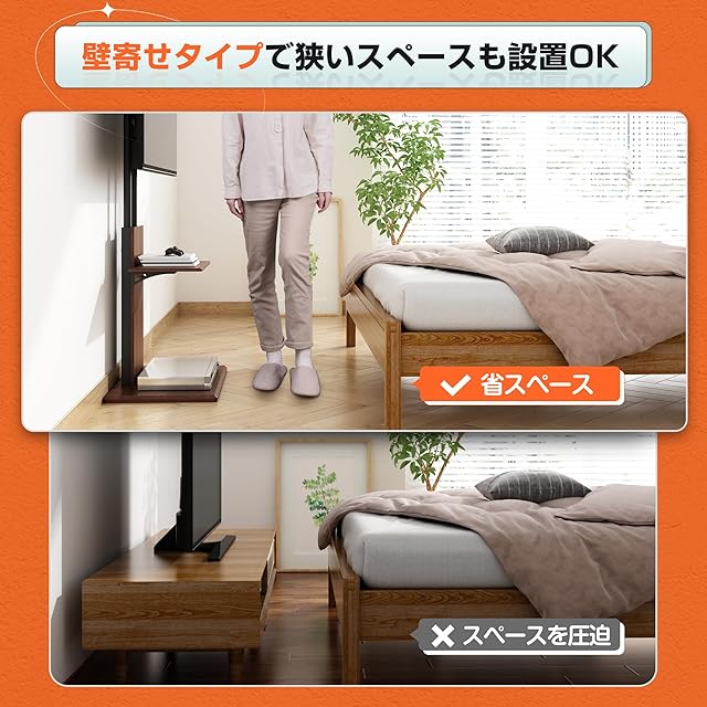 壁寄せテレビスタンド:支柱から壁まで8㎝なので、スタイリッシュで省スペーステレビスタンドです。場所の制約をなくし、あらゆる場所をテレビを楽しむ空間に変えます。大型テレビを設置しても、部屋を広く、美しくなります。