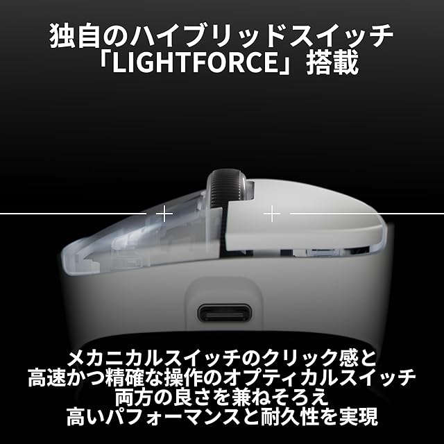 ロジクールG独自のハイブリッドスイッチ「LIGHTFORCE」を搭載/メカニカルスイッチのクリック感と高速かつ精確な操作のオプティカルスイッチ、両方の良さを取り入れたハイブリッドスイッチ/高いゲーミングパフォーマンスと耐久性を実現