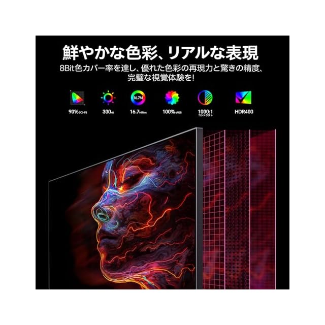 広色域:178°視野角のFast IPSパネルを採用、90%DCI-P3色カバー率 と 100%sRGB高色域、鮮やな映像を映し出す。300cd/m2の輝度で8Bit·約1677万色表示、1000:1コントラスト比の27インチモニター