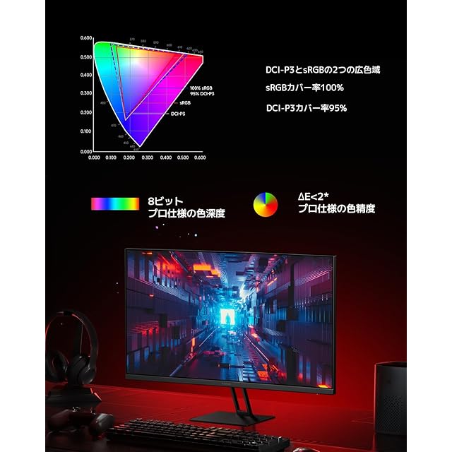 【豊富なカラーで、滑らかなグラデーションを表現】 DCI-P3カバー率95%およびsRGBカバー率100%の広色域が、豊かでリアルな色を表示する大型カラーディスプレイを実現します。8ビットの色深度が、鮮明で詳細な色のグラデーションを提供し、色の滑らかな遷移を可能にしてゲーム体験をレベルアップさせます。