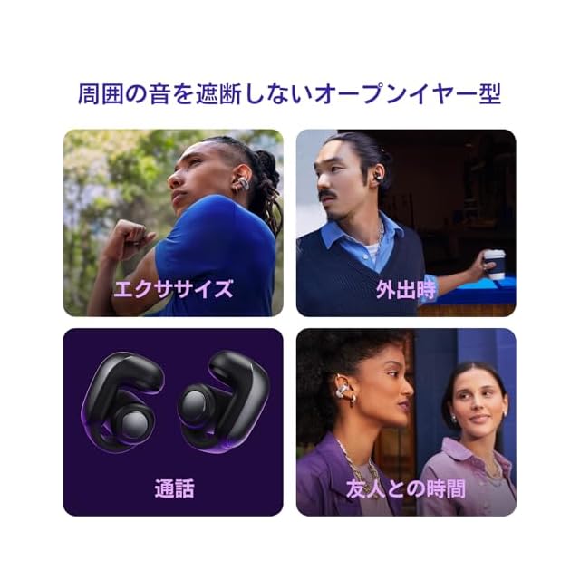 外の世界にも耳を澄ませる: 豊かな空間オーディオを楽しみながら、周囲とのつながりも保つリスニング体験。オープンイヤーの開放型デザインのワイヤレスイヤホンは、「周りとのつながりも大切にしている」というメッセージを発信する一方で、OpenAudioテクノロジーが高品質のプライベートサウンドを実現します。