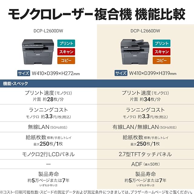 プリント速度(片面):モノクロ約34枚/分、液晶パネル:2.7型TFTタッチパネル
