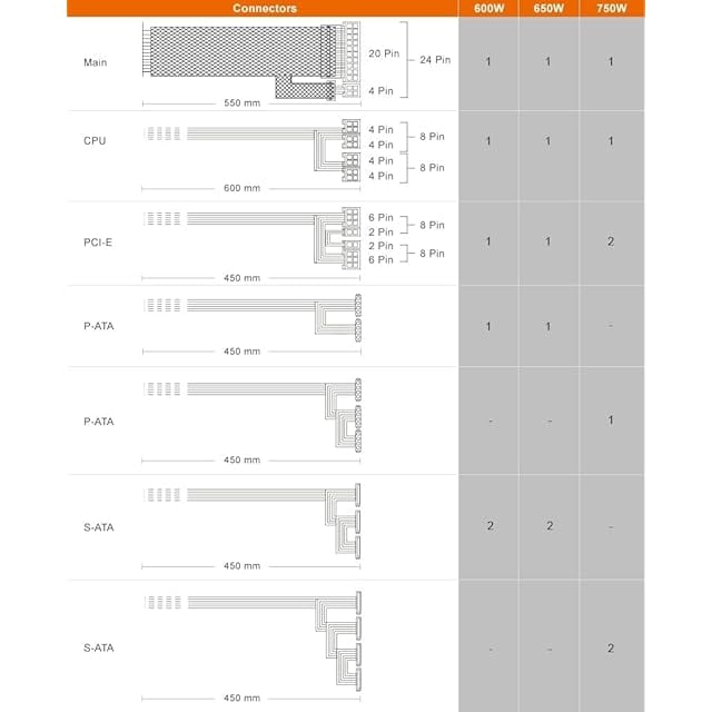 【コネクタ】Main:24(20+4)ピン、コネクタ数×1、本数×1、長さ:550㎜ / CPU:8(4+4)ピン、コネクタ数×2、本数×1、長さ:600㎜ / PCI-E:8(6+2)ピン、コネクタ数×4、本数×2、長さ:450㎜ / SATA:5ピン、コネクタ数×8、本数×2、長さ:450㎜/ P-ATA:4ピン、コネクタ数×3、本数×1、長さ:450㎜
