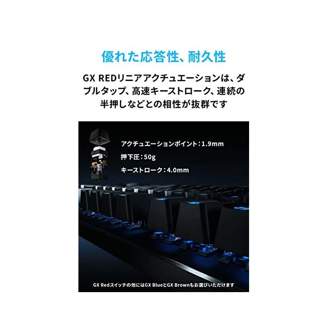 【GXリニアスイッチ】赤軸に似たような滑らかな打ち心地と極めて静かな打鍵音が特徴です。よくゲームしながらボイスチャットするなら静音のリニアスイッチをおすすめ