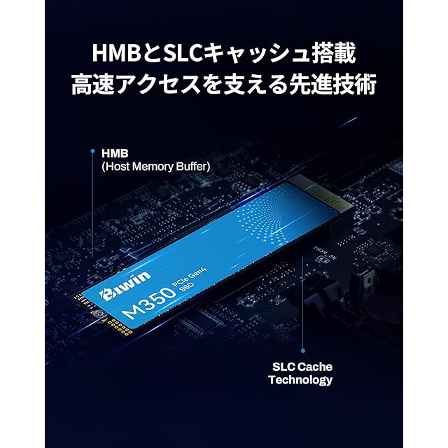 【HMB+SLCキャッシュ】DRAMを搭載せずに高速動作を実現するHMBとSLCキャッシュ技術を組み合わせ、ランダムアクセスの最適化と転送速度の安定化を両立。起動やアプリの立ち上げも快適に。