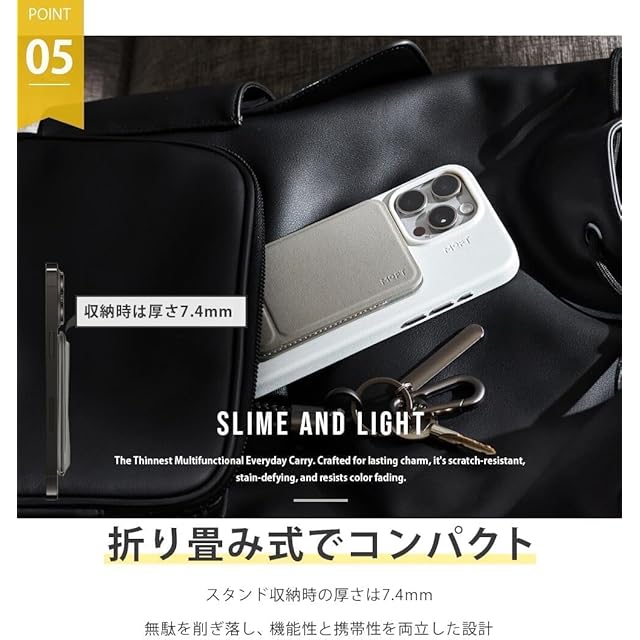 【特許取得設計!一体式折り畳み構造】 折り畳み時の厚さわずか0.74cmのカードサイズから展開して、頑丈なスマホスタンドに早変わりします。底部の三角形構造で安定性を高めました。
