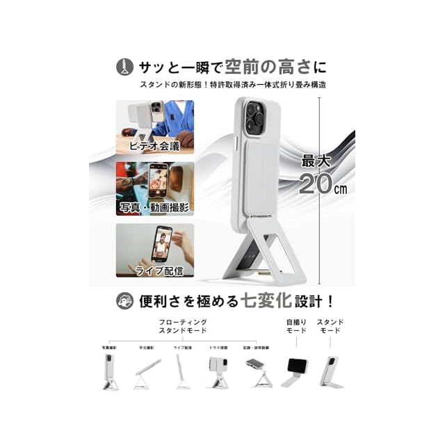 【様々なシーンで活躍!超高位置レンズ&多角度】 スマホのカメラレンズを最大20cmの高さに設置でき、角度も自由に調節することが可能です。動画撮影、ビデオ会議、ライブ配信などで活躍します。