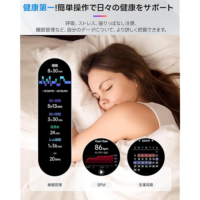 【200以上の文字盤デザイン&睡眠管理機能】このスマートウォッチは、200種類以上の文字盤デザインを自由に設定可能で、ユーザーの好みやシーンに応じてカスタマイズできます。さらに、睡眠管理機能を搭載しており、睡眠の質を詳細に分析し、改善のためのアドバイスを提供します。これにより、ユーザーは自身の睡眠パターンを把握し、より健康的な生活リズムを築くことができます。毎日の睡眠データを確認することで、生活習慣の改善にも役立ちます。