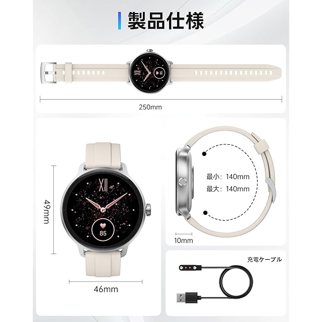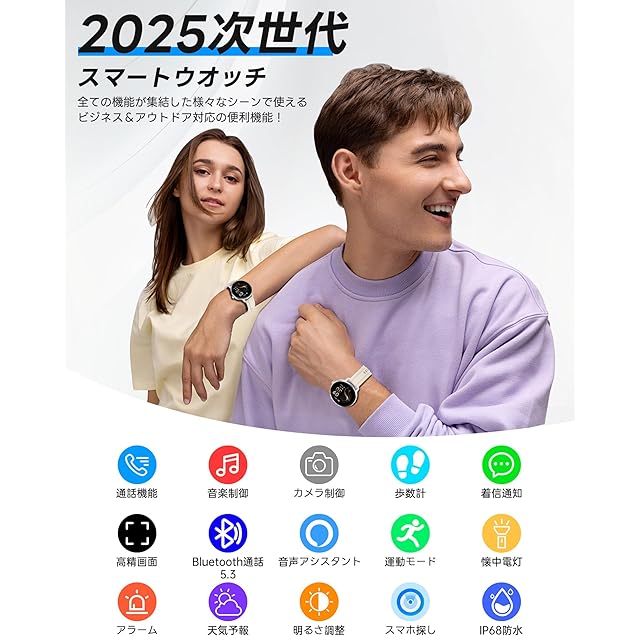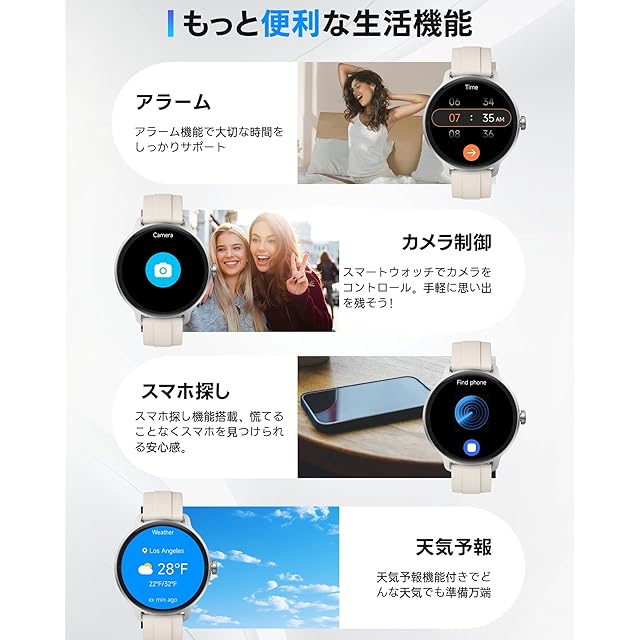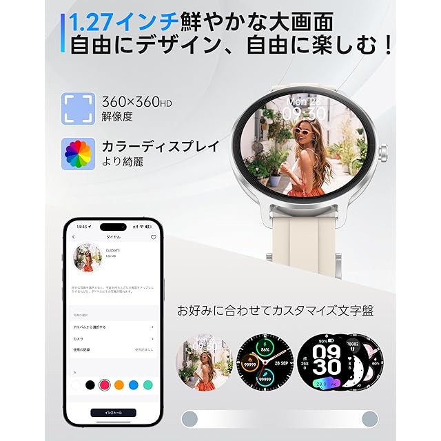 商品名:スマートウォッチ 丸型 iPhone対応&アンドロイド対応 Bluetooth5.3通話機能付き LINE通知 100+運動モード 運動の自動検知機能 IP68防水 高精細画面 1.27インチ 200+文字盤自由設定 睡眠管理 女性生理周期 5-7日間のバッテリー持続 実用機能満載 天気予報 音楽制御 アラーム通知