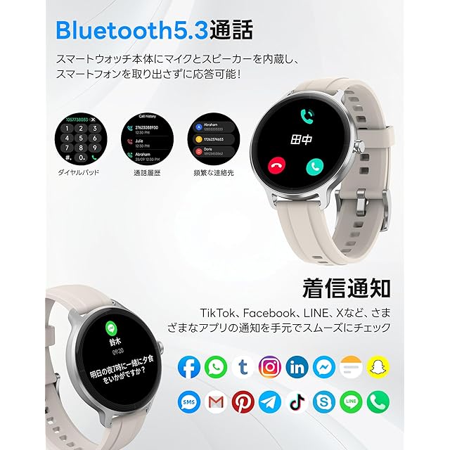 【Bluetooth 5.3通話機能&メッセージ通知】このスマートウォッチは、Bluetooth 5.3技術を搭載しており、通話品質が大幅に向上しています。iPhoneやAndroidスマートフォンとの接続がスムーズで、手首から直接電話を受けることが可能です。さらに、色んなアプリの通知機能も完備しており、メッセージや着信をリアルタイムで確認できます。忙しい日常でも、重要な連絡を見逃すことなく、常に情報をキャッチアップできます。これにより、仕事やプライベートでのコミュニケーションがより便利になります。