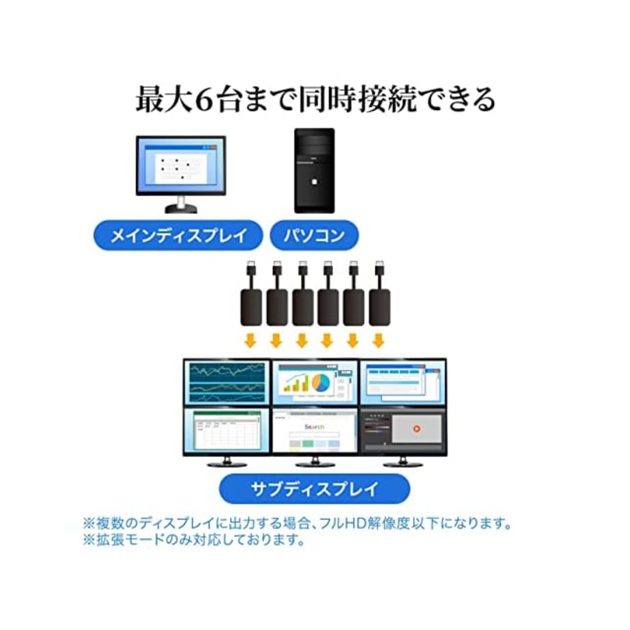 1台のパソコンに対して最大6台まで同時接続が可能です。ノートパソコンの画面を含め最大7画面をマルチディスプレイ化することが可能です。※フルHD解像度以下の場合に限ります。