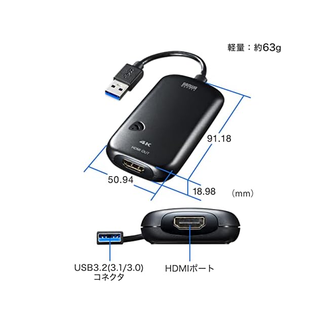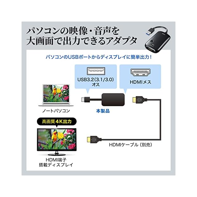 商品名:サンワサプライ USB3.0-HDMIディスプレイアダプタ 4K対応 (USB Aコネクタ オス-HDMIコネクタ メス) USB3.2 Gen1準拠 USB-CVU3HD2N ブラック