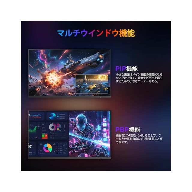 【生産性向上の画面分割機能】PBPとPIP機能を搭載し、1つのモニターに複数のタスクを同時に表示でき、左右分割画面とPIP表示をサポートします。 仕事、映画鑑賞、音楽鑑賞、ゲームなどを複数の画面で同時に行うことができ、作業効率が倍増します。