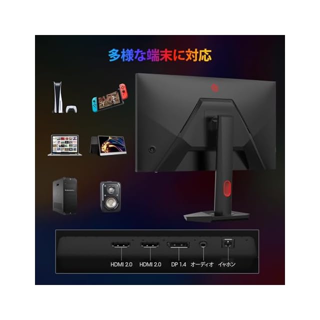 【豊かな接続性&人間工学デザイン】DP(1.4)*1、HDMI(2.0)*2、3.5mmオーディオ*1、様々な端子に対応。スクリーンは縦横の回転、高さの調整、ピッチの角度微調整、左右の角度微調整、壁掛け(VESA規格100*100mm)が可能で、ブラケット中央の丸いフレームはケーブルの整理やデスクトップの整頓に利用できます。