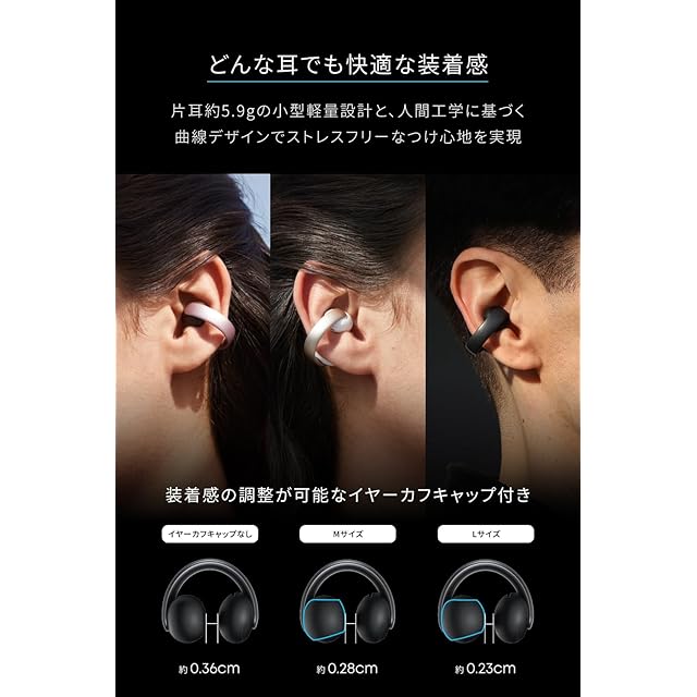 どんな耳でも快適な装着感:片耳約5.9gの小型軽量設計と、人間工学に基づく曲線デザインでストレスフリーなつけ心地を実現。装着感の調整が可能なイヤーカフキャップ付き。