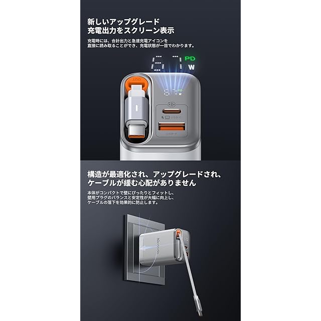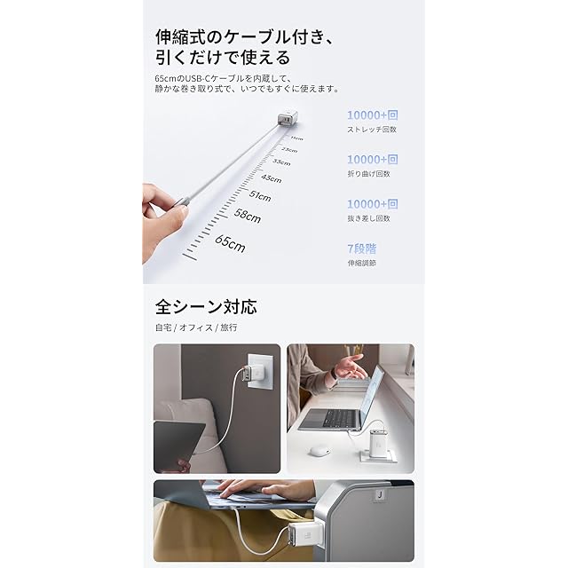 【新モデルアップグレード、スクリーンに充電出力を表示】:充電時には、合計出力と急速充電アイコンを直接に読み取ることができ、充電状態が一目でわかります。【伸縮式のケーブル付き、引くだけで使える】:65cmのUSB-Cケーブルを内蔵して、静かな巻き取り式で、いつでもすぐに使えます。10000回以上のストレッチ回数・10000回以上の抜き差し回数・10000回以上の折り曲げ回数を耐えます。ケーブルの長さが7段階に伸縮調節できます。自宅、オフィス、旅行、全シーンに対応します。