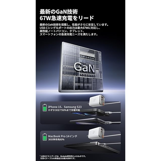 【最新のGaN技術、67W急速充電をリード】:最新のGaN技術を搭載し、性能がさらに安定しています。USB-Cシングルポートの出力は最大67Wに対応し、高性能ノートパソコン、タブレット、スマートフォンの急速充電ニーズを満たします。iPhone 15は、わずか30分で60%まで充電可能です。Samsung S23は、わずか30分で60%まで充電可能です。MacBook Pro 14インチは、わずか30分で40%まで充電可能です。※上記のテストデータは、Mcdodo研究所によるものです。USB-Cケーブルの単独出力は最大60Wです。【磁気吸着カードスロット、ワンプル・ワンリターン、手動でのケーブル整理不要】:「カチッ」。デスク周りが整然としています。外出先でも、簡単に収納可能です。