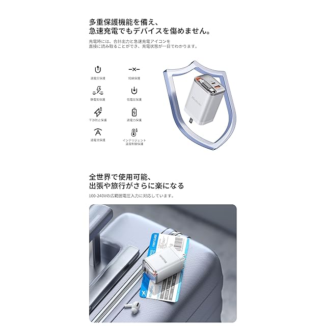 【多重保護機能を備え、急速充電でもデバイスを傷めません】:本67W GaN 急速充電器は、過電圧保護・短絡保護・静電気保護・低電圧保護・干渉防止保護・過電力保護・過電流保護・インテリジェント温度制御保護など保護機能を持ちます。また、この製品はPSE認証を取得しており、安心してご使用いただけます。【全世界で使用可能、出張や旅行がさらに楽になる】:100-240Vの広範囲電圧入力に対応しています。【構造が最適化され、アップグレードされ、ケーブルが緩む心配がありません】:本体がコンパクトで壁にぴったりとフィットし、壁用プラグのバランスと安定性が大幅に向上し、ケーブルの落下を効果的に防止します。【安心の品質】:Mcdodo製品は、12ヶ月のがついています。ご不明な点やお困りのことがございましたら、お気軽にメールにてお問い合わせください。24時間以内に迅速に対応させていただきます。(注文番号が書の代わりになります)。【パッケージ内容】:Mcdodo 67W 急速充電器 伸縮式USB-Cケーブル付き GaN充電器 *1つ、取扱説明書*1つ、カード*1つ。
