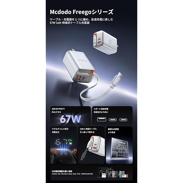 商品名:Mcdodo 67W GaN 急速充電器 Type-C充電器 PD対応 USB-C & USB-Aポート【伸縮式Type-Cケーブル付き/GaN新技術/出力デジタル表示/折りたたみ式プラグ】PD3.0/QC4.0/PPS等規格対応 MacBook iPad iPhone Galaxy Android スマホ ノートPC その他対応 PSE技術基準適合 ホワイト