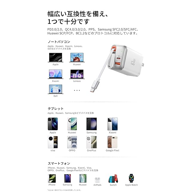 【幅広い互換性があり、1つでこと足りる】:PD3.0/2.0、QC4.0/3.0/2.0、PPS、Samsung SFC2.0/SFC/AFC、Huawei SCP/FCP、BC1.2などのプロトコルに対応。ノートパソコン、タブレット、スマートフォン、Switch、腕時計、ヘッドフォンなど、その他のデバイスにも対応。【3台のデバイスを、同時にフル充電できる】:同時充電時には、インテリジェントに電力が配分されます。単一ポート使用時:USB Type-Cポート:67W、USB Type-Aポート:30W、自動巻き取り式ケーブル:60W。
