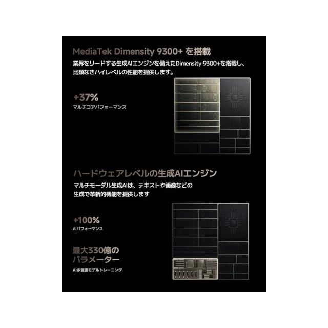 【高性能AIチップが、作業効率やあなたの創造力をサポート】AI人工知能処理に優れたフラッグシップチップ「MediaTek Dimensity D9300+」を搭載。Google Geminiを搭載し、画面をなぞるだけで検索ができる「かこって検索」にも対応。文字起こしや字幕の生成、翻訳などを行うAI言語機能の他、写真の背景に合わせて周辺の様子を生成して背景を拡大する「AI拡大」機能などにより、作業効率や創造力をサポートします。