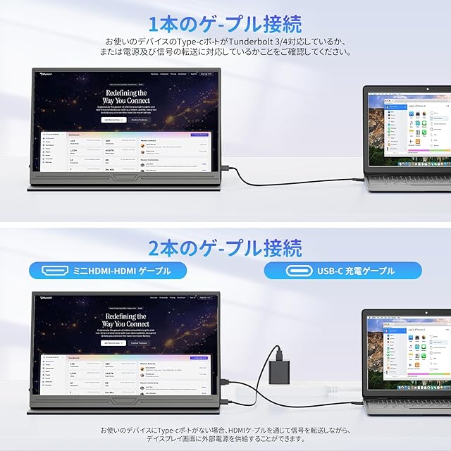 【ケーブル1本で映像出力と給電実現】デバイス側はフル機能のType-C端子があれば、USB-Cケーブル1本で映像出力と電源供給が可能でございます。(ご注意:THUNDERBOLT 3/4対応の端末でご利用ください)USB type-C端子対応のモバイルディスプレイは、USB Type-Cポート搭載のノートPC、Androidスマホ、任天堂Switch、MacBookなどの端末と接続が可能です。* 電圧を安定させ、コントラストや輝度、音量などを向上させるため、付属の電源アダプターを利用して電力供給してください。