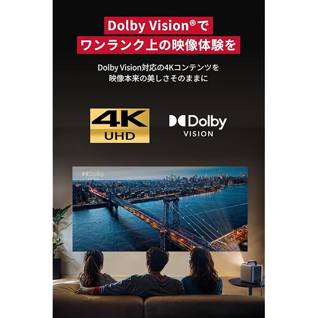 Dolby Visionで、ワンランク上の映像体験:映像本来の美しさを正確に再現し、より明るく鮮やかな映像を実現。Dolby Vision対応の4Kコンテンツを映像本来の美しさでお楽しみいただけます。 Nebula初ハイブリッド光源:レーザーとLED光源を組み合わせたハイブリッドビーム技術を採用。1800ANSIルーメンの明るさと10.7億色もの広色域を実現し、より緻密な色彩で映像を表現。 独自エンジン「NebulaMaster」搭載:フレームごとに綿密な映像調整を施すことで、鮮明なコントラストと正確な色彩を表現。映像本来の繊細さをお楽しみいただけます。 Dolby Digital Plusでより臨場感溢れるサウンドを:15Wのスピーカードライバーを2つ搭載し、大迫力で、臨場感溢れる、まるで映画館のようなサウンドを自宅でお楽しみいただけます。