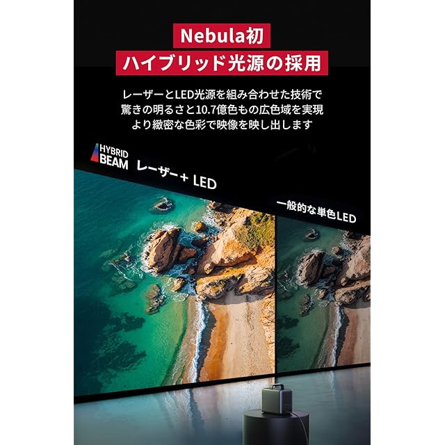 【Nebula初ハイブリッド光源】レーザーとLED光源を組み合わせたハイブリッドビーム技術を採用。1800ANSIルーメンの明るさと10.7億色もの広色域を実現し、より緻密な色彩で映像を表現。