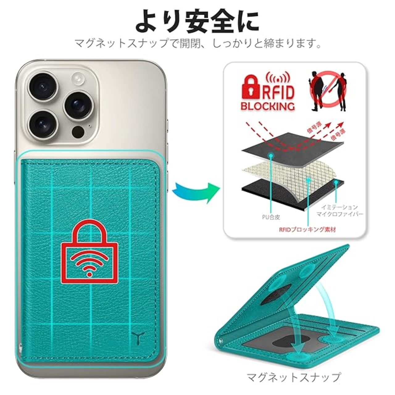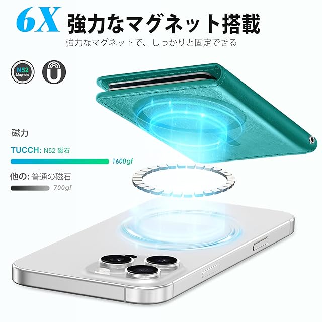 [TUCCH] スマホカードケース 磁気吸着 6枚カード収納 [RFIDブロッキング] PU合皮 脱着簡単 軽量 背面 カードウォレット 磁気ウォレットケース iPhone 16/15/14/13/12シリーズ対応 シアン
