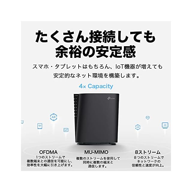 [たくさん繋がる] 最大100台と繋がる。OFDMA / 4x4 MU-MIMO / 8ストリームの合わせ技で、Wi-Fiに繋がる商品が多くても安定してたっぷりと繋がります。