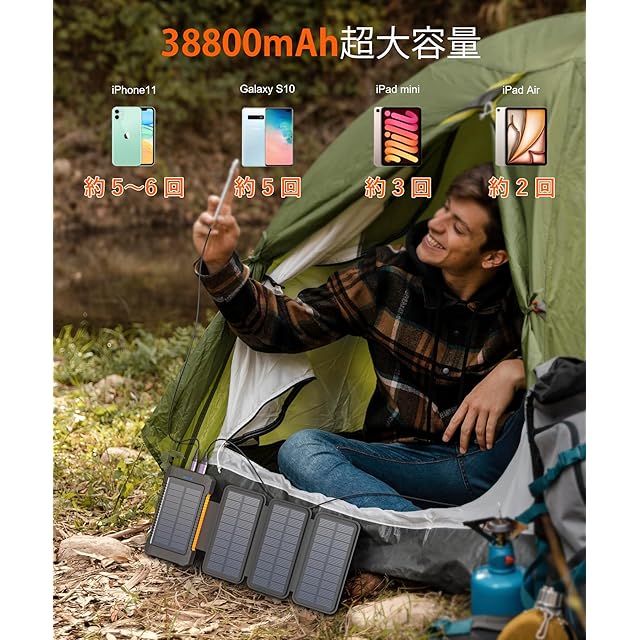 【38800mAh超大容量・軽量小型ソーラー充電器】38800mAhの超大容量バッテリーを搭載しており、フル充電後は長時間使用できます。 iPhone 14を約6回、Galaxy S23を約5回、iPad miniを約3回、Airport Proを約25回充電できる大容量ソーラーモバイルバッテリーです。サイズはわずか13.7*7.7*2cm、重さはわずか300gで、他のソーラーパワーバンクの半分の重さで、日本の状況に合わせた多彩な蓄電方式で、キャンプ、登山、ハイキングなどのアウトドア活動に最適で、停電、地震、災害時の非常用バッテリーとしてもご利用いただけます。日常の出張にも大変便利です。
