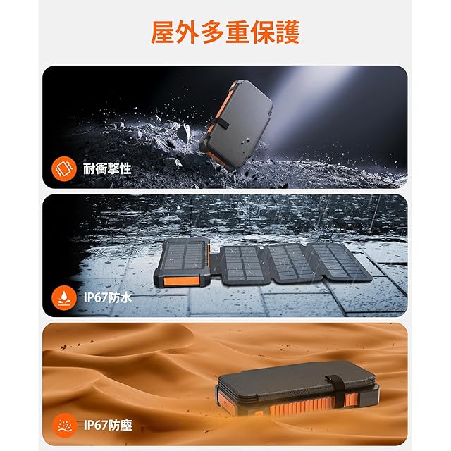 【IP67防水・防塵・耐衝撃】IP67の防水防塵性能を持ち、USBポートにはプラスチックのカバーが付いています。全体の構造は頑丈で耐久性があり、強風、粉塵、突然の雨などあらゆる悪天候にも耐える非常用バッテリー。また、ソーラーパネルは単結晶シリコンでできており、太陽を吸収し、防水・防塵性にも優れています。ソーラーモバイルバッテリーの四面はシリコンで保護されているため、耐衝撃、屋外での使用もより安全です。