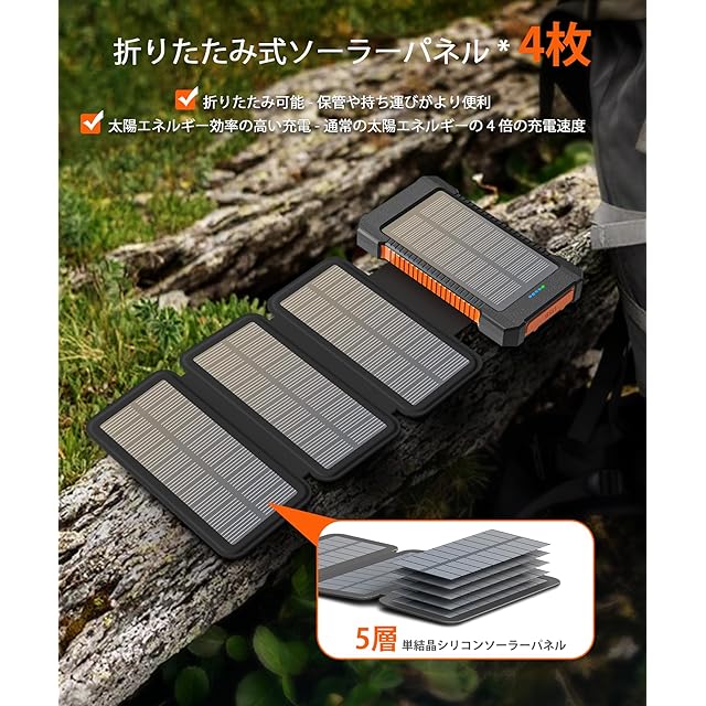 【4枚ソーラーパネル & より強力なソーラー充電】4つのソーラーパネルを搭載しており、ソーラー充電速度は通常のソーラーパワーバンクよりも4倍速く、折りたたみ可能なソーラーパネルは、効率的に充電するために太陽エネルギーを利用し、持ち運びにも非常に便利です。特に日本のような特殊な地理環境を持つ国では、突然の地震、津波、雪崩などの緊急事態に直面した場合、太陽エネルギーを蓄えるモバイルバッテリーを所有することは、災害に対応する非常に良い方法でもあります。