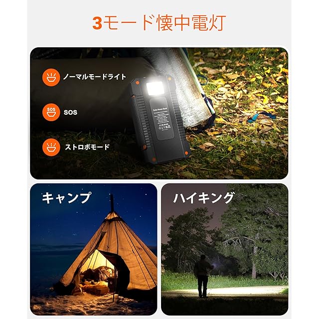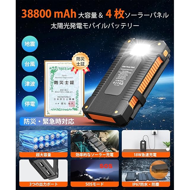 商品名:モバイルバッテリー ソーラー 充電器 大容量 38800mAh【18W 急速充電 4枚 & ソーラーパネル】 ソーラーモバイルバッテリー SOS 高輝度LEDライト ソーラー充電器 3USB出力ポート IP67防水 耐衝撃 ソーラーチャージャー 非常用バッテリー 携帯便利 災害用バッテリー iPhone/iPad/Android/Galaxy 防災グッズ 地震/災害/停電/アウトドアなどに対応