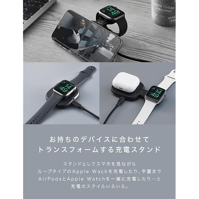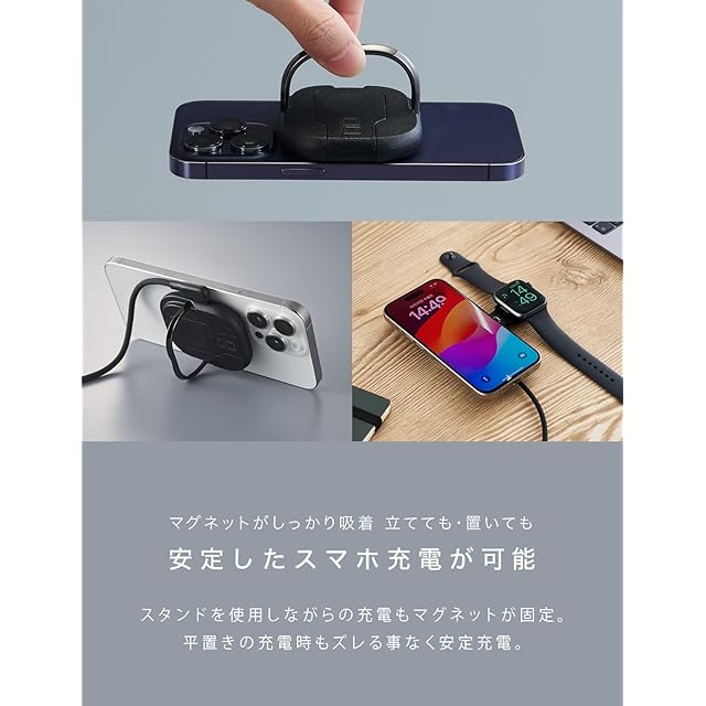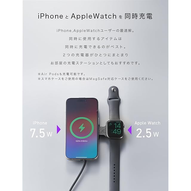 【iPhoneとApple Watchを同時充電】iPhone 15 など、iPhone12以降のmagsafe対応機種とApple Watch(アップルウォッチ)の同時充電が可能です。コンパクトなフォルムに最大15W出力(iPhone充電時は7.5Wが最大出力)と最大2.5W出力、2つの充電器が搭載され、マグネット吸着により適切な位置で充電が可能です。※こちらはApple MFi非認証品です。watchOSのアップデートにより使用できなくなる場合がございます。