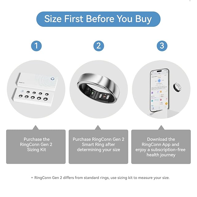 【購入前にサイズ確認】RingConn Gen 2スマートリングは他社の健康リングとは異なる独自のサイズ基準を採用しています。RingConn Gen 2サイズキットを使用することで、指に最も快適で正確なフィット感を見つけられ、購入前に正しいサイズを選択することで返品や交換の手間を防ぎます