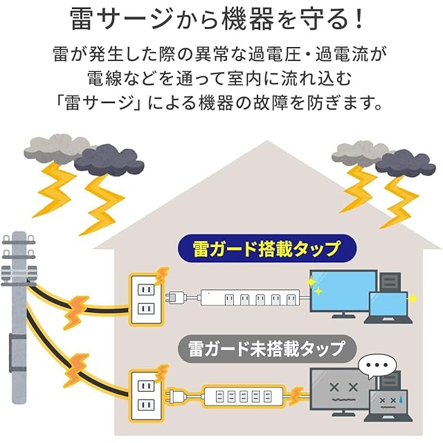 内蔵されたサージ吸収素子(バリスタ)が雷サージを吸収し、接続機器を守ります。