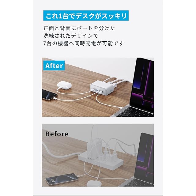 これ1台でデスクがスッキリ:正面と背面にポートを分けた洗練されたデザインで、7台の機器へ同時充電が可能です。